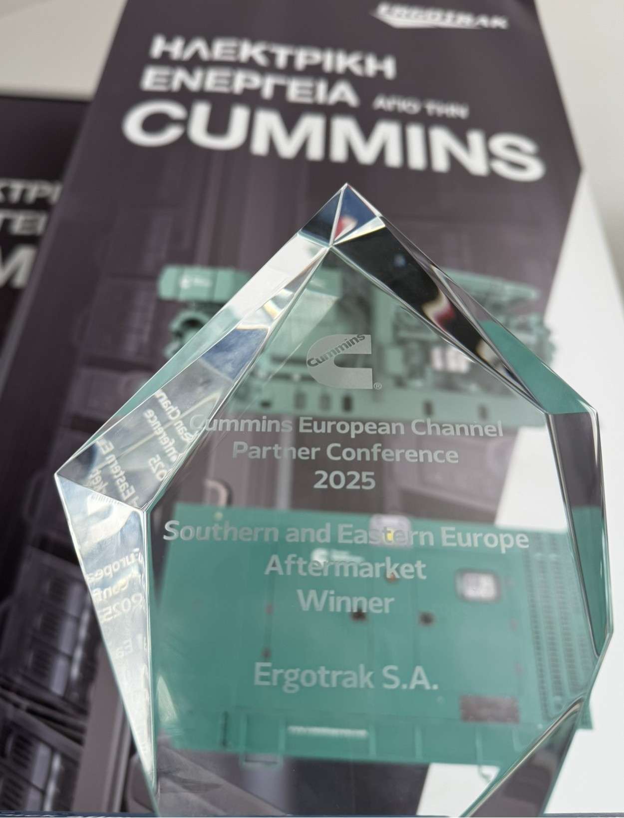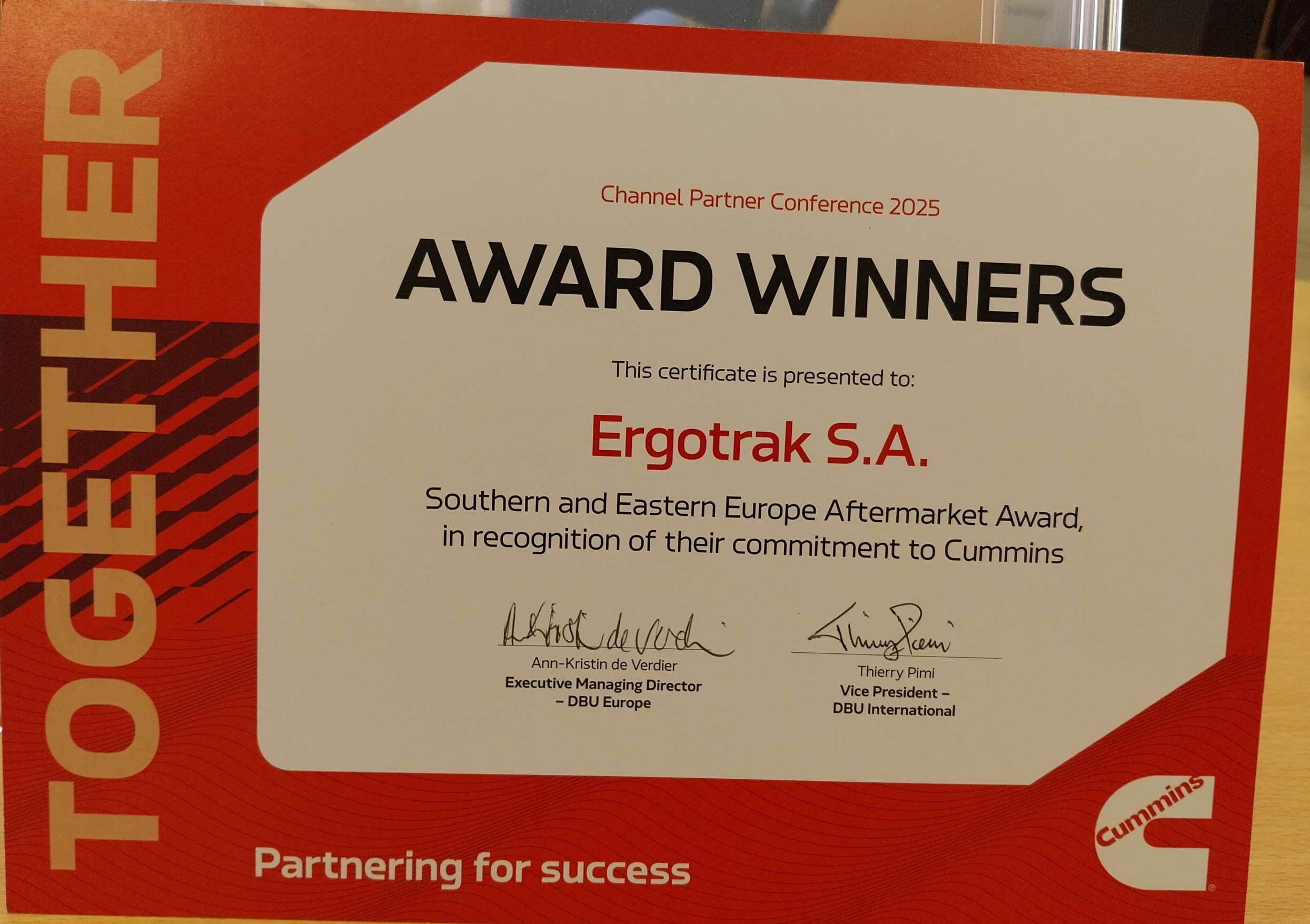 Η ERGOTRAK τιμήθηκε με το Southern and Eastern Europe Aftermarket Award, σε αναγνώριση της δέσμευσής της προς την Cummins και της εξαιρετικής απόδοσής της στον τομέα των aftermarket υπηρεσιών και ανταλλακτικών. Η βράβευση πραγματοποιήθηκε στο πλαίσιο της European Channel Partners Conference 2025, που έλαβε χώρα στη Μαδρίτη, με κεντρικό θέμα “Power Onward: Partnering for Success”.